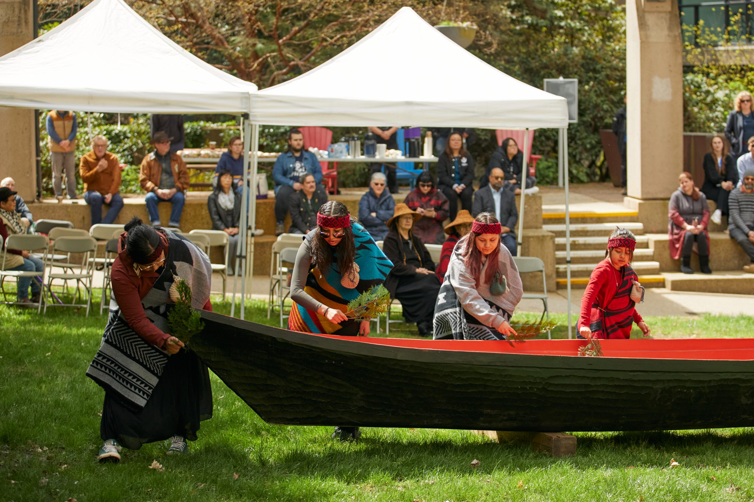 Skw’cháys is a 30-foot Coast Salish canoe commissioned in 2018 to celebrate CapU’s 50th anniversary. Ses siyam (Ray Natraoro) and Xats’alanexw siyam (Victor Harry) carved the seaworthy hunting canoe in the winter of 2019, giving students, employees and the community the unique opportunity to witness the transformation from 800-year-old red cedar (the Elaho Valley, northwest of Whistler) to Skw’cháys. Following cultural protocol, the University hosts ceremonies to awaken Skw’cháys every spring and put him to sleep every fall.