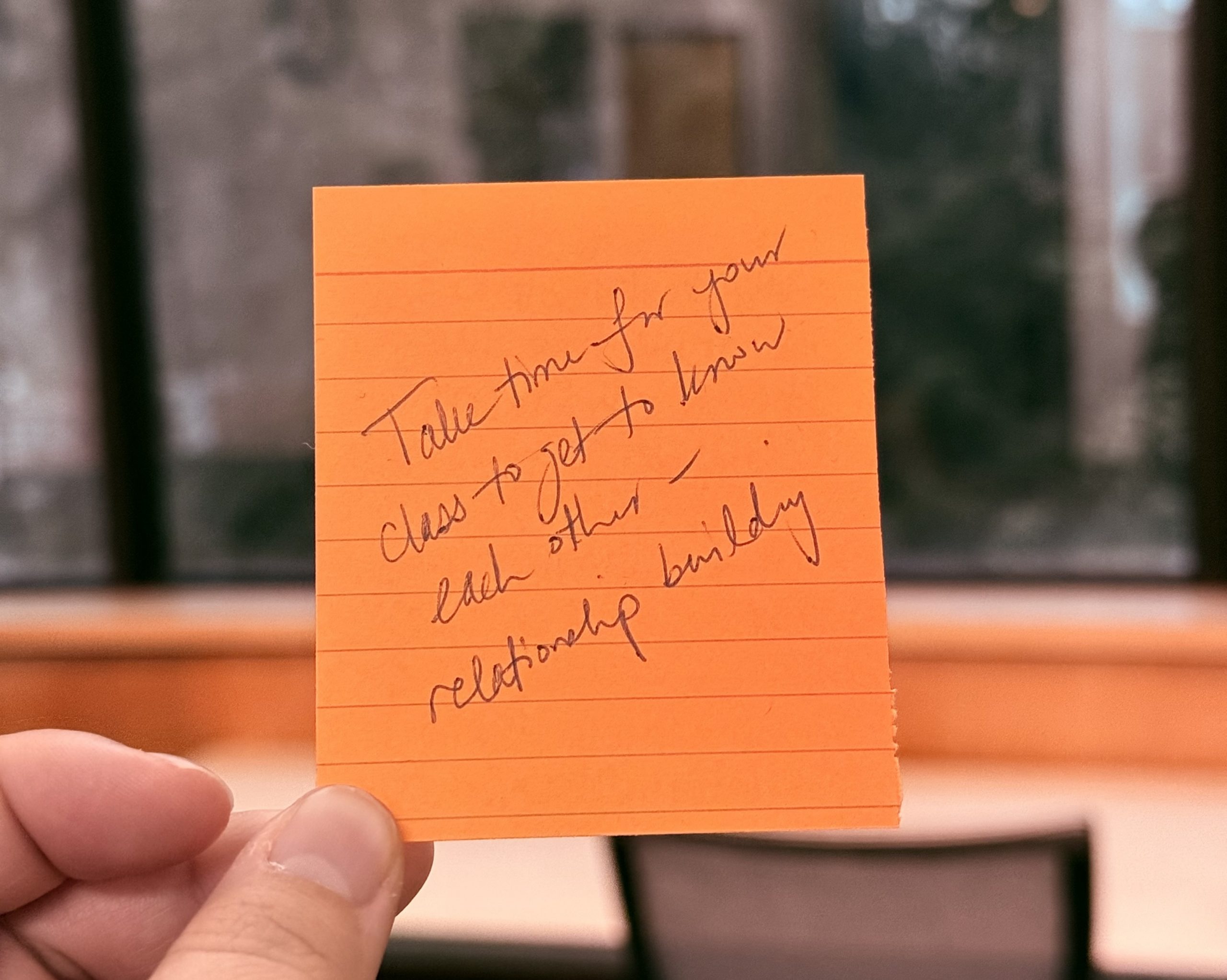 The card reads: “take time for your class to get to know eachother—relationship building